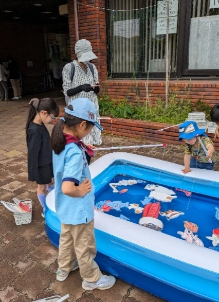 ビニールプールの中にクリップを付けた魚(発泡スチロール)を浮かべておき、子どもたちは糸の先に磁石を付けた釣り竿で釣り上げます。特に大きな魚や少し取りにくい小さな魚を釣った時は「やったー!」という歓声も。譲り合いながら、楽しく遊んでいました。