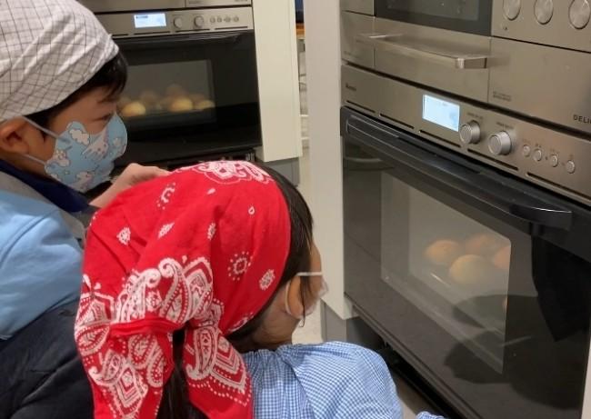材料を泡だて器で良く混ぜて、できた生地をスプーンでカップに入れ、オーブンで焼きます。
