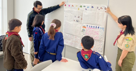 この組集会では、ふた組のカブスカウトたちは、組ごとに分かれて、全員が印象に残った集会について話し合い、それぞれイラストを交えての記事を書き上げて、かべ新聞にまとめて発表する準備をしました。